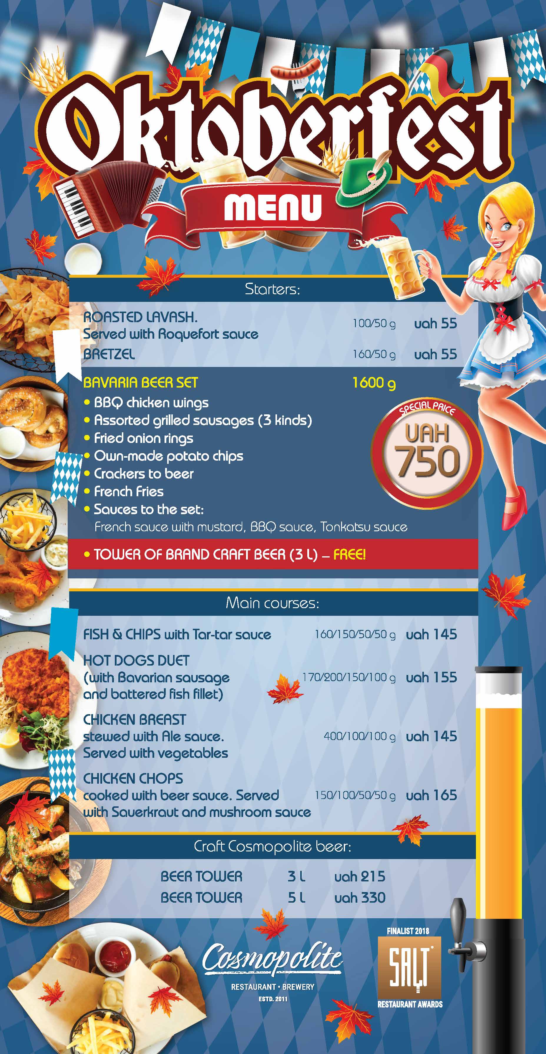We at Cosmopolite restaurant-brewery are strongly determined to celebrate the most beery holiday - Oktoberfest!