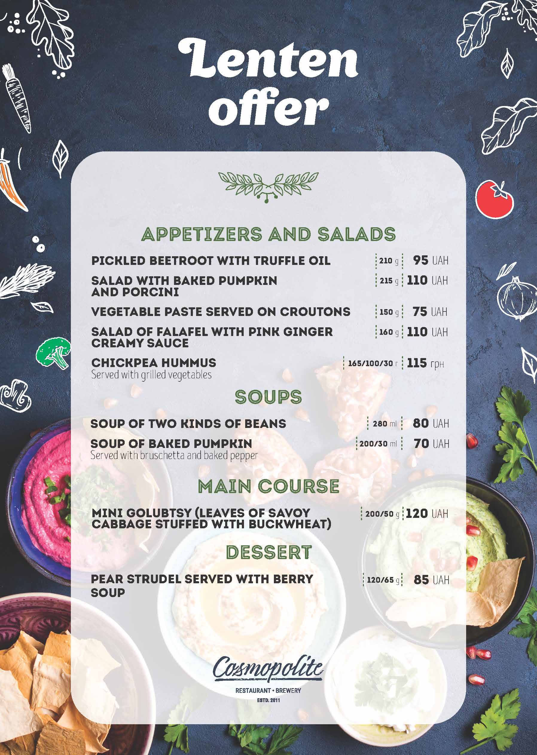 The Chef of Cosmopolite restaurant has developed rich and tasty Special Lenten Offer which includes appetizers and salads, soups and main course as well as dessert.