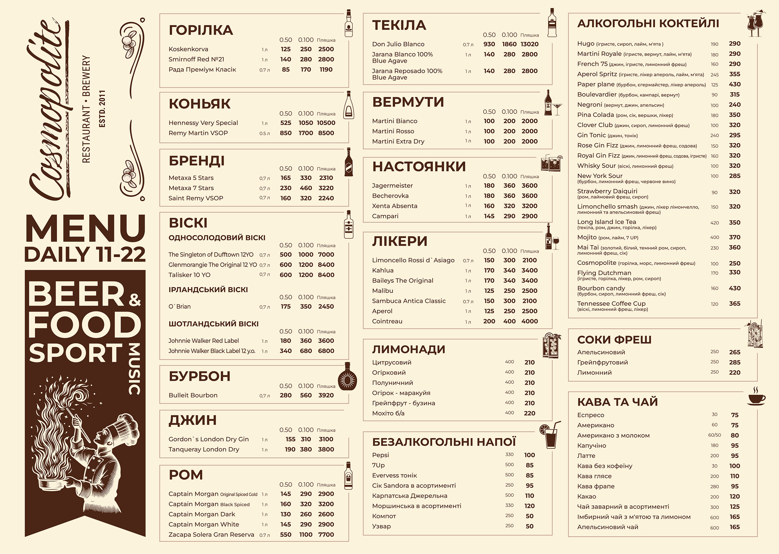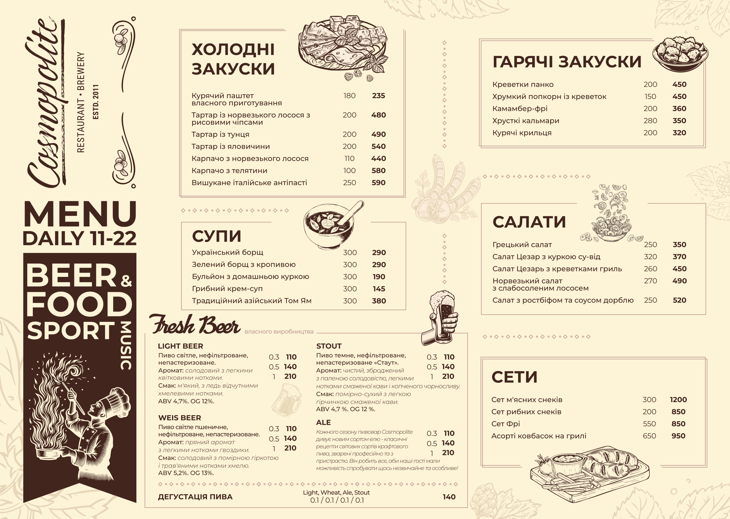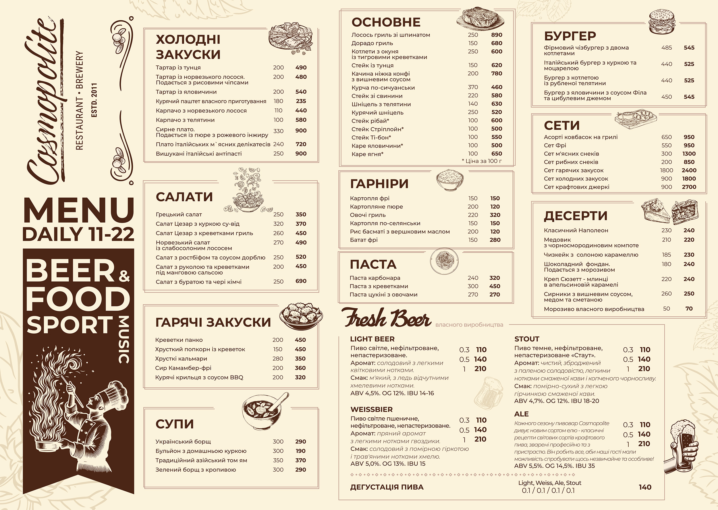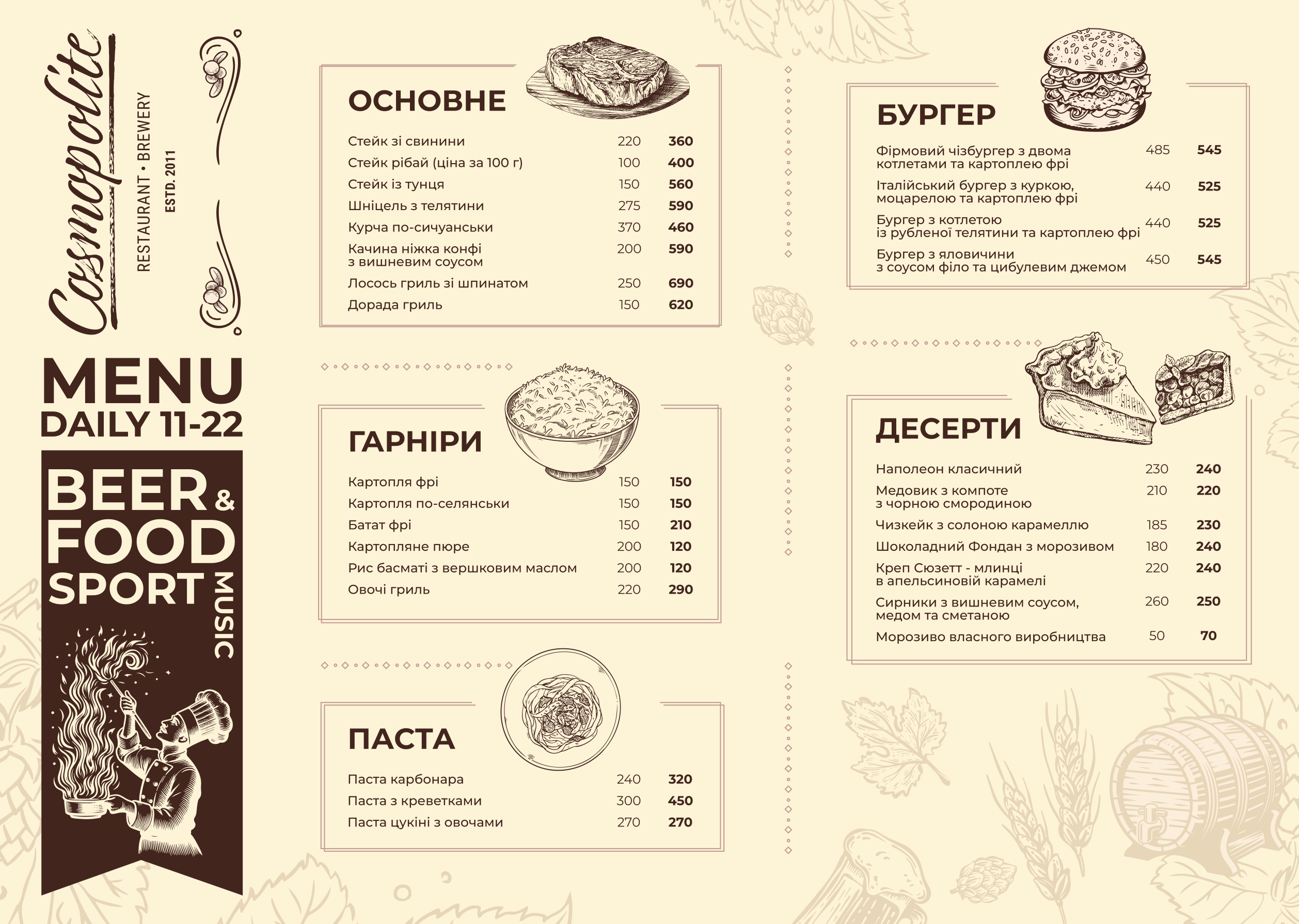 Меню ресторана-пивоварни Cosmopolite