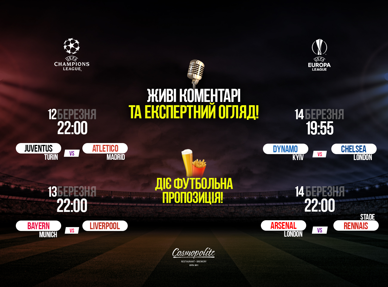 Ресторан-пивоварня Cosmopolite приглашает всех на футбольный праздник 12, 13 и 14 марта!
