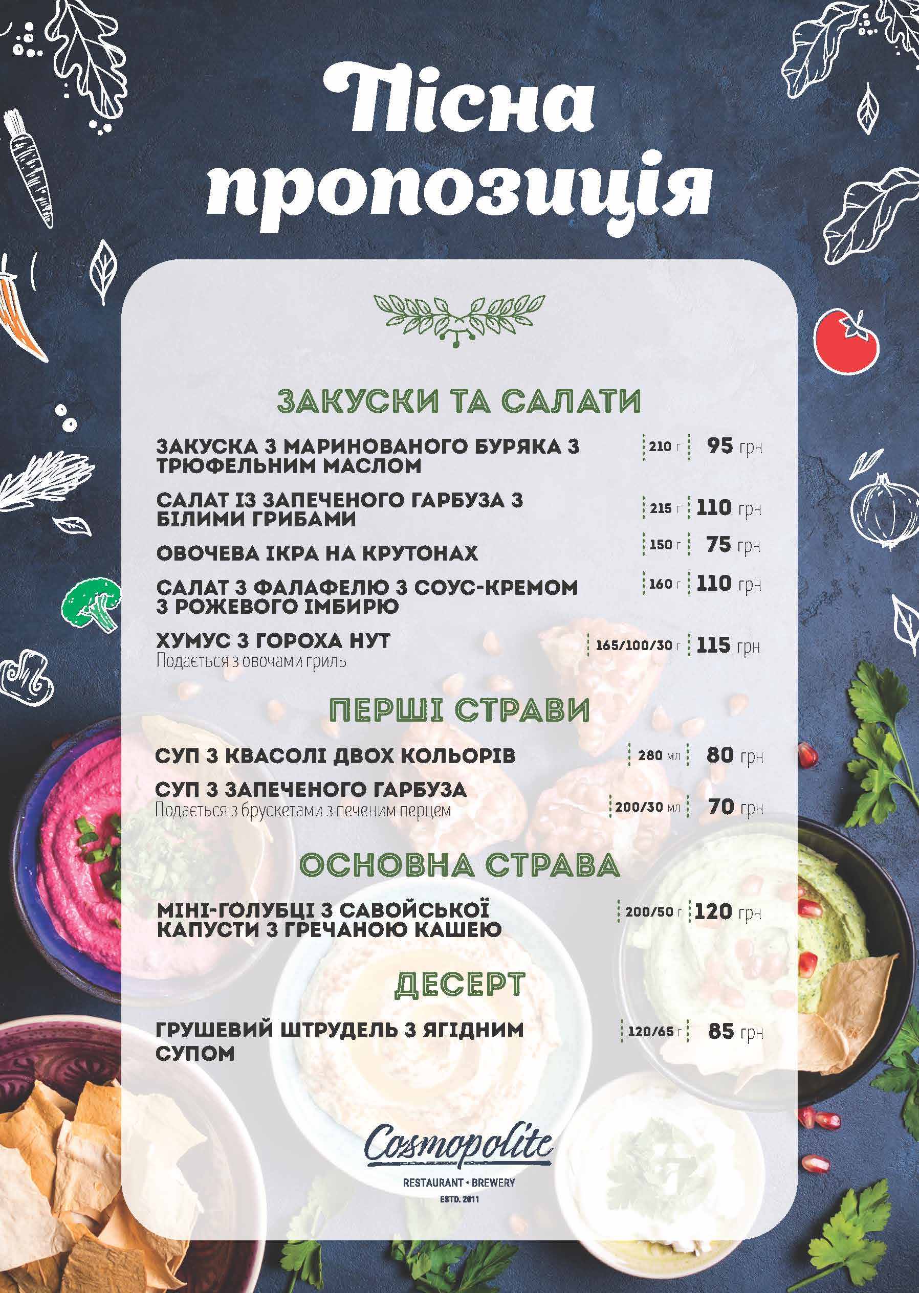 Пісне Меню Cosmopolite - повноцінна кулінарна пропозиція, що складається із закусок і салатів, перших і основних страв, а також десертів.