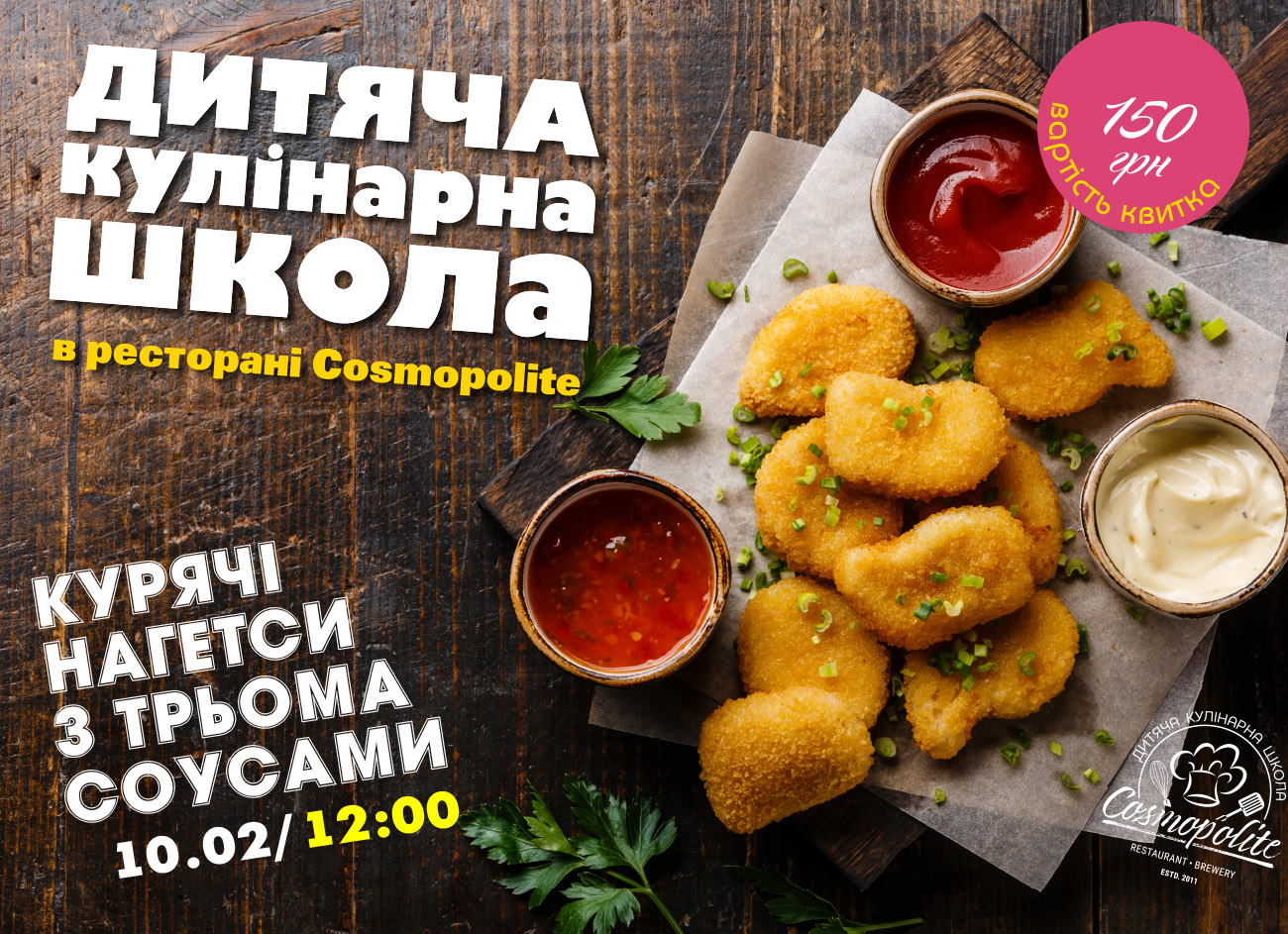 Команда маленьких кулінарів під керівництвом нашого кухаря приготує смачну та корисну страву - курячі нагетси та три соуси до них.