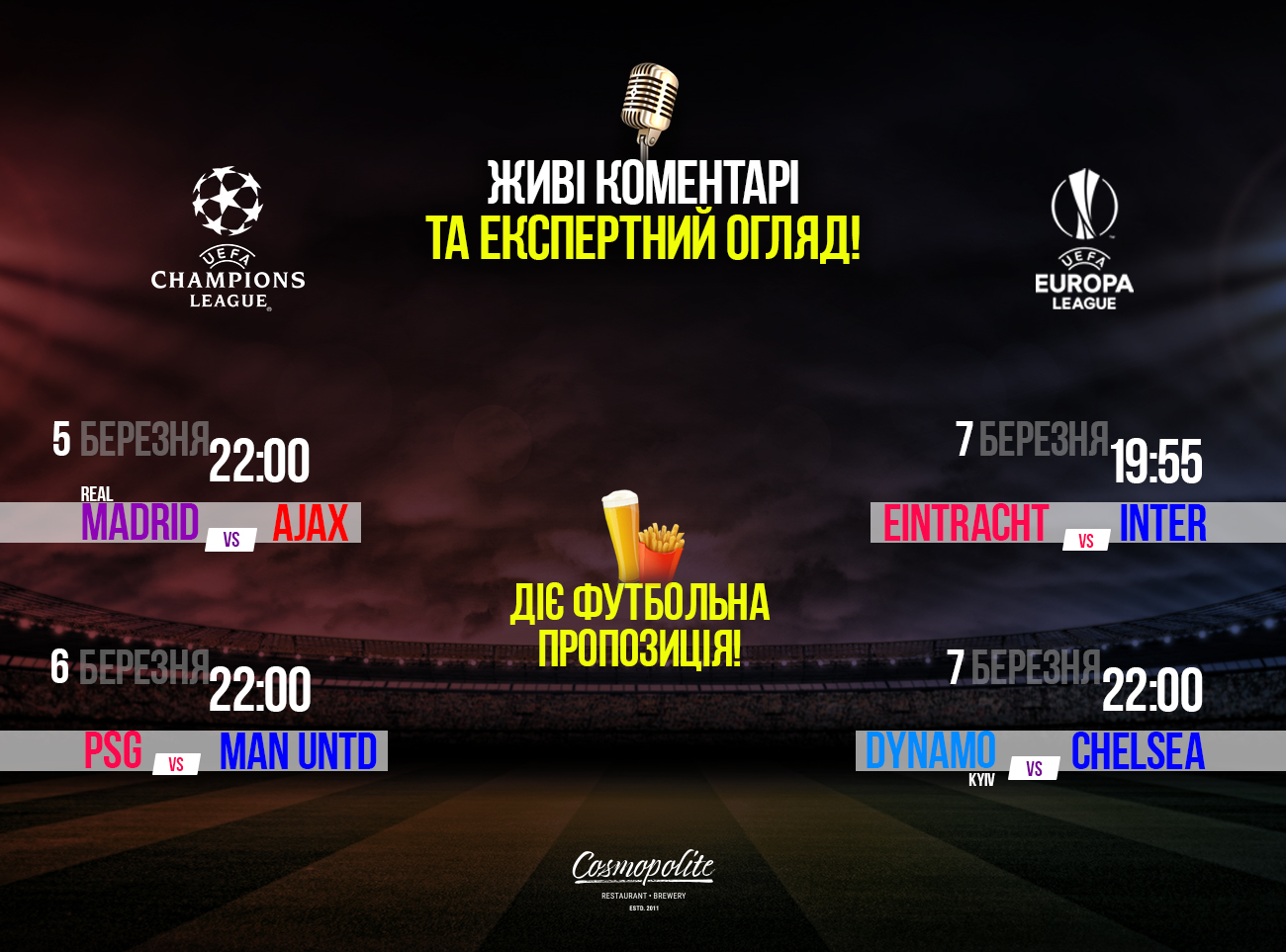 Ресторан-броварня Cosmopolite запрошує усіх на футбольне свято 5, 6 і 7 березня!