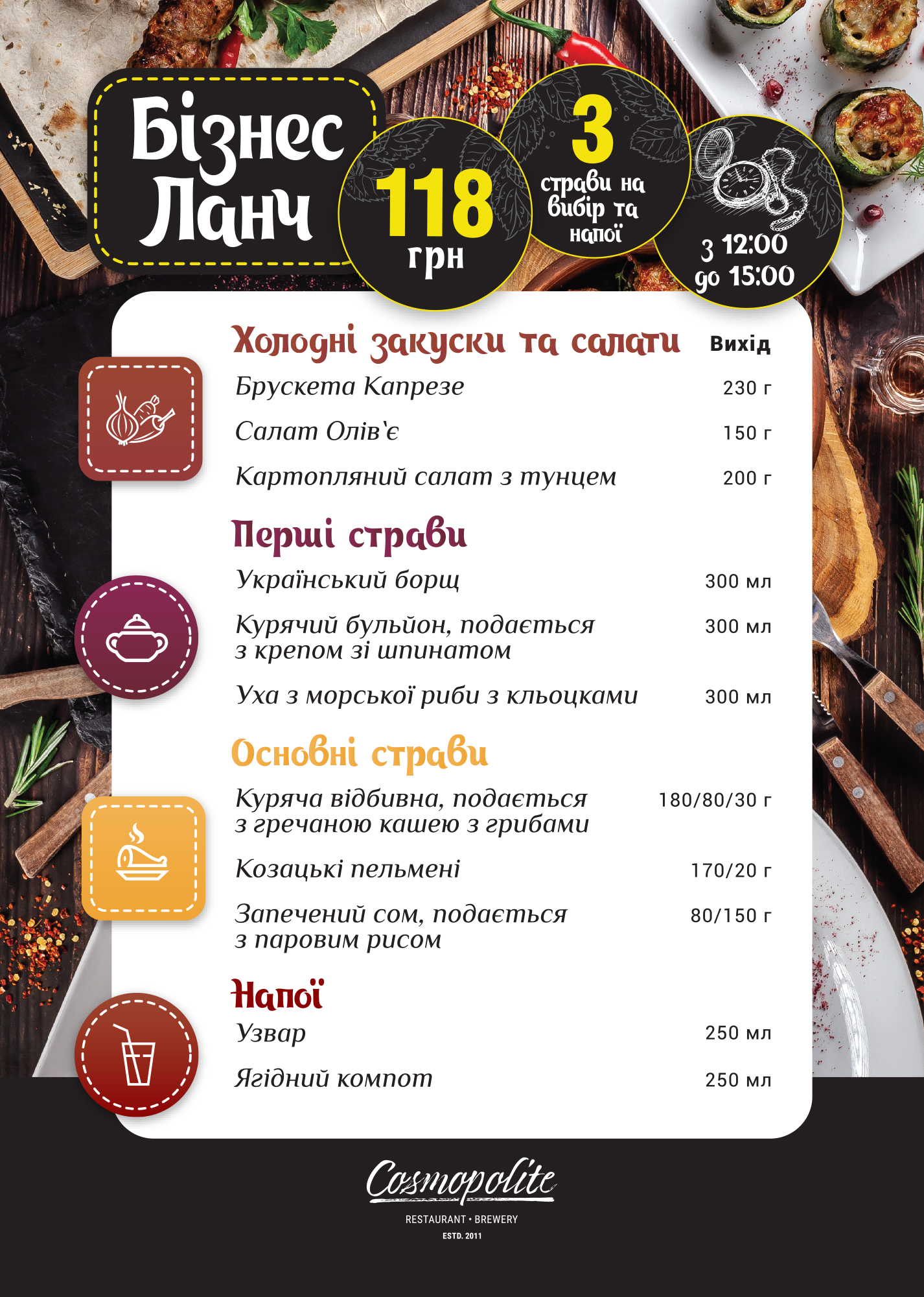 Ми пропонуємо вам 3 страви на вибір. Ланч-пропозиція включає закуски і салати, перші та основні страви, і напій - компот або узвар. Вартість ланчу - 118 гривень.